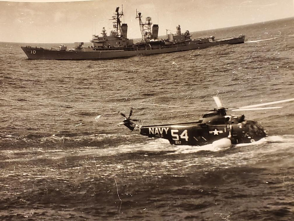 A nearby Navy destroyer, the USS King [DLG-10], had observed the rollover and promptly dispatched a motor whale boat to pick up the men. Carlton recalled, “They took us to the pier at North Island where we were then taken to the North Island Hospital to be out checked out by a doctor. We were OK and pretty soon, we were headed back to the Kearsarge on board one of our own SH-3As.”
